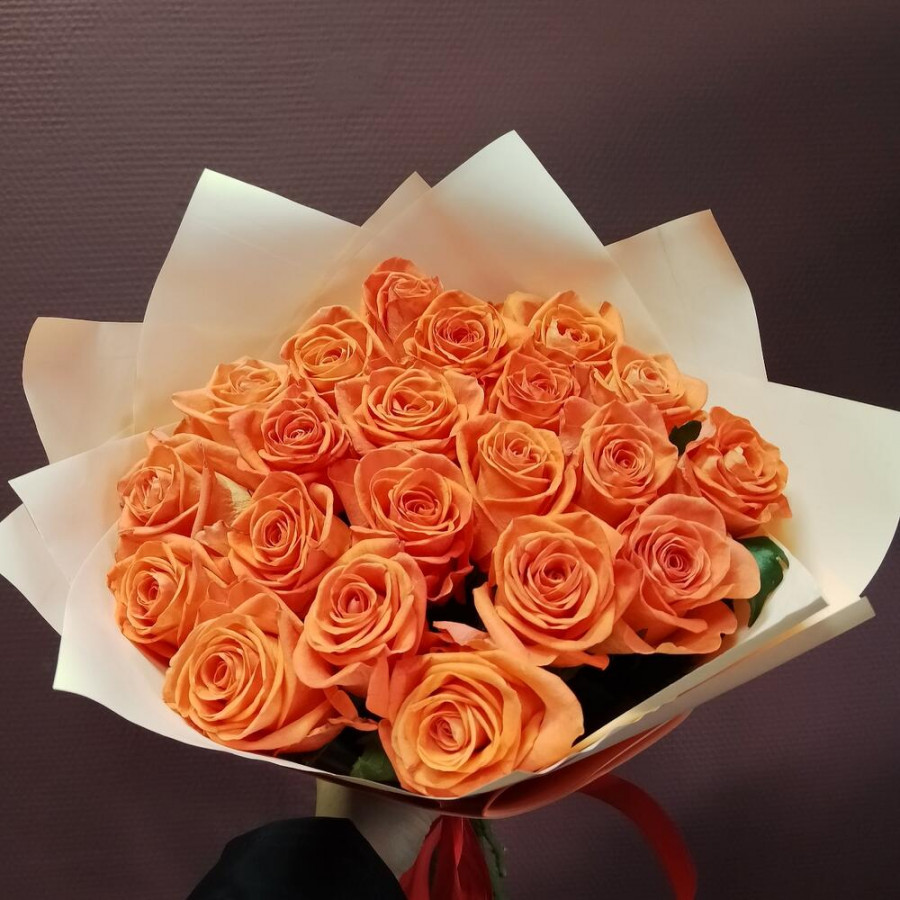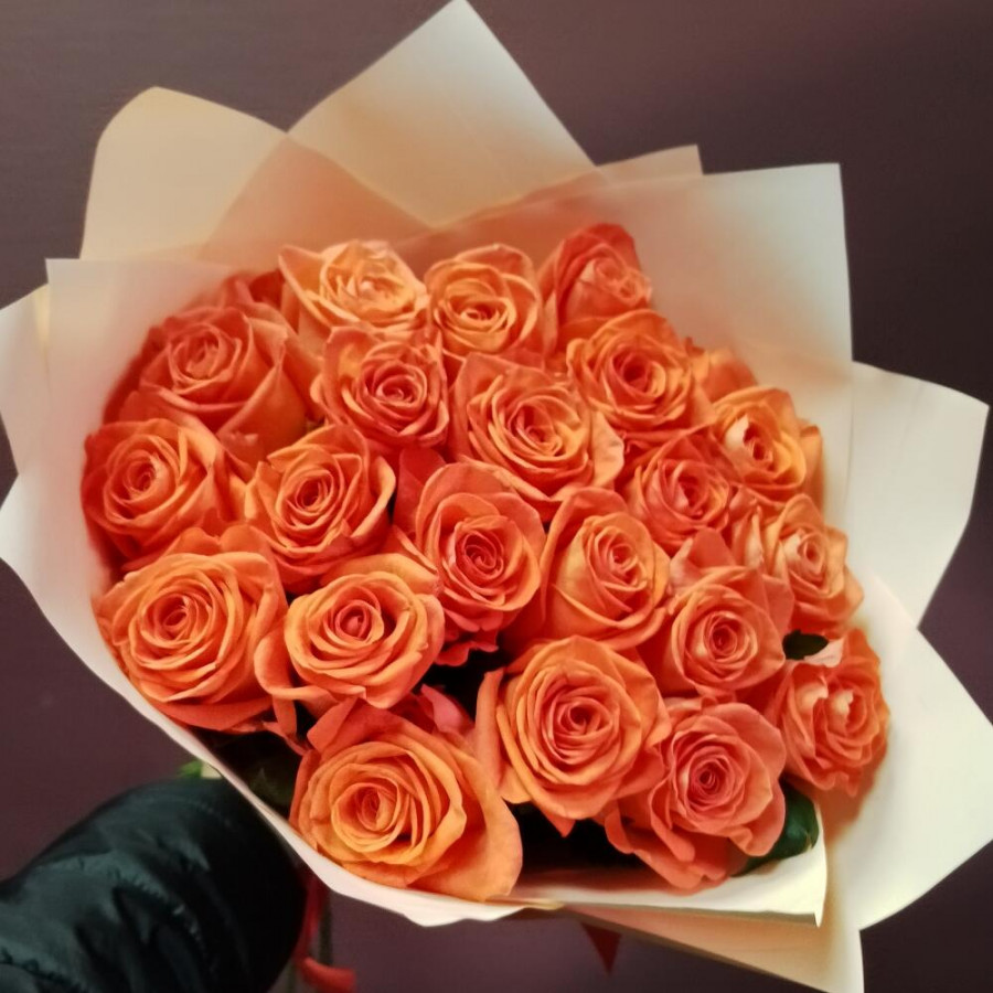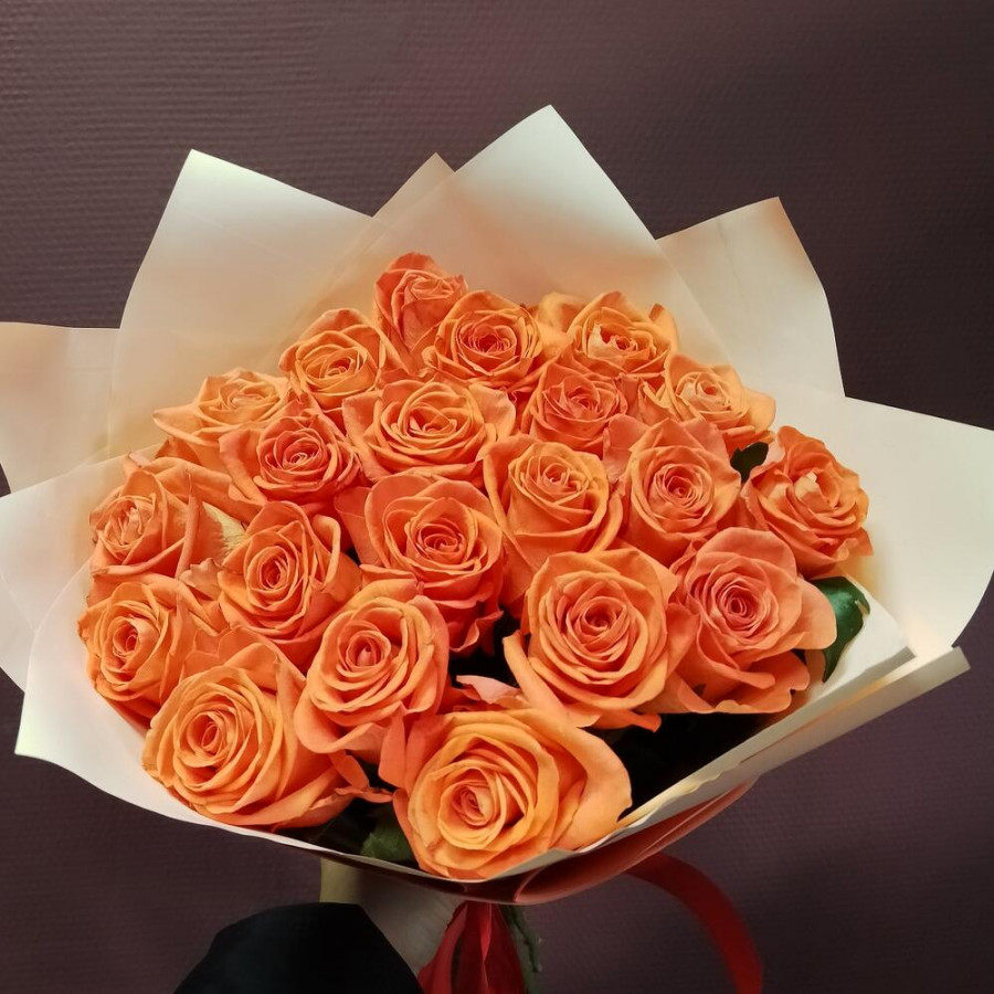 На фото букет из 19 оранжевых роз. В составе: роза 19 шт, дизайнерская упаковка 1 шт, атласная лента 1 шт, . Все цветы свежие и ароматные, букет красиво оформлен и отлично подходит для подарка. Доступна доставка цветов или самовывоз.