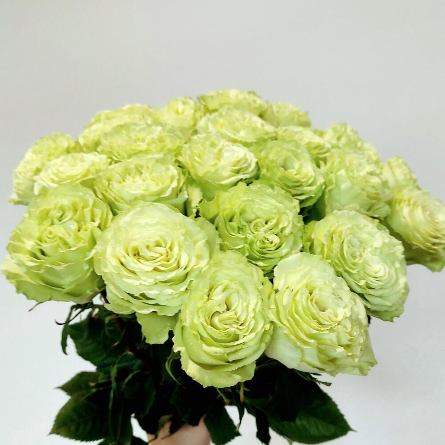 На фото букет из 21 зеленой розы. В составе: пионовидная роза 21 шт, атласная лента 1 шт, . Все цветы свежие и ароматные, букет красиво оформлен и отлично подходит для подарка. Доступна доставка цветов или самовывоз.