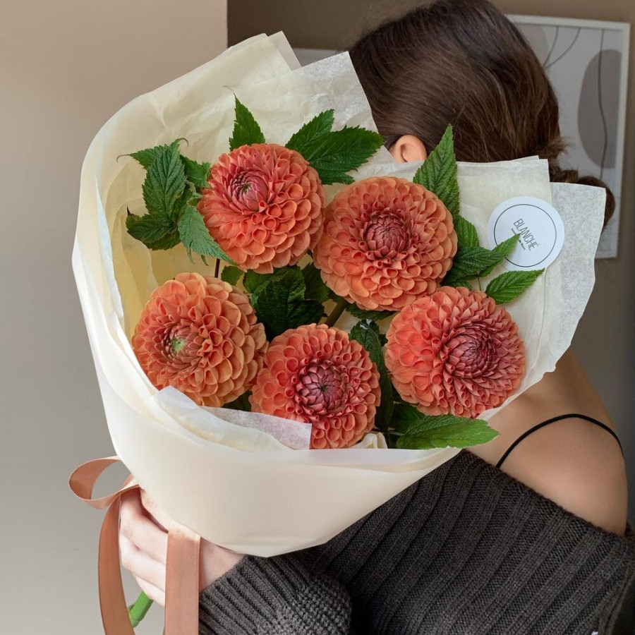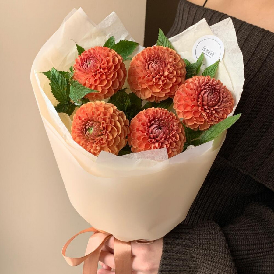 На фото букет из 5 оранжевых георгин. В составе: георгина 5 шт, зелень 2 шт, дизайнерская упаковка 1 шт, атласная лента 1 шт, . Все цветы свежие и ароматные, букет красиво оформлен и отлично подходит для подарка. Доступна доставка цветов или самовывоз.