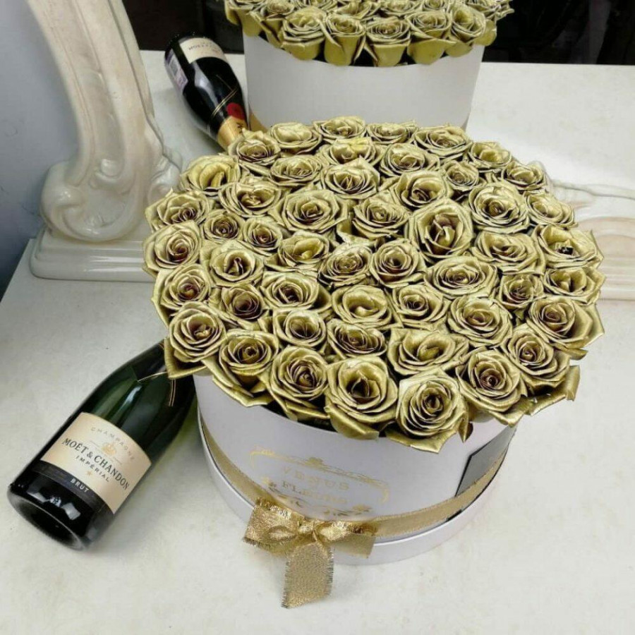 На фото букет из 51 золотой розы в коробке. В составе: роза 51 шт, оазис флористический 3 шт, атласная лента 1 шт, . Все цветы свежие и ароматные, букет красиво оформлен и отлично подходит для подарка. Доступна доставка цветов или самовывоз.