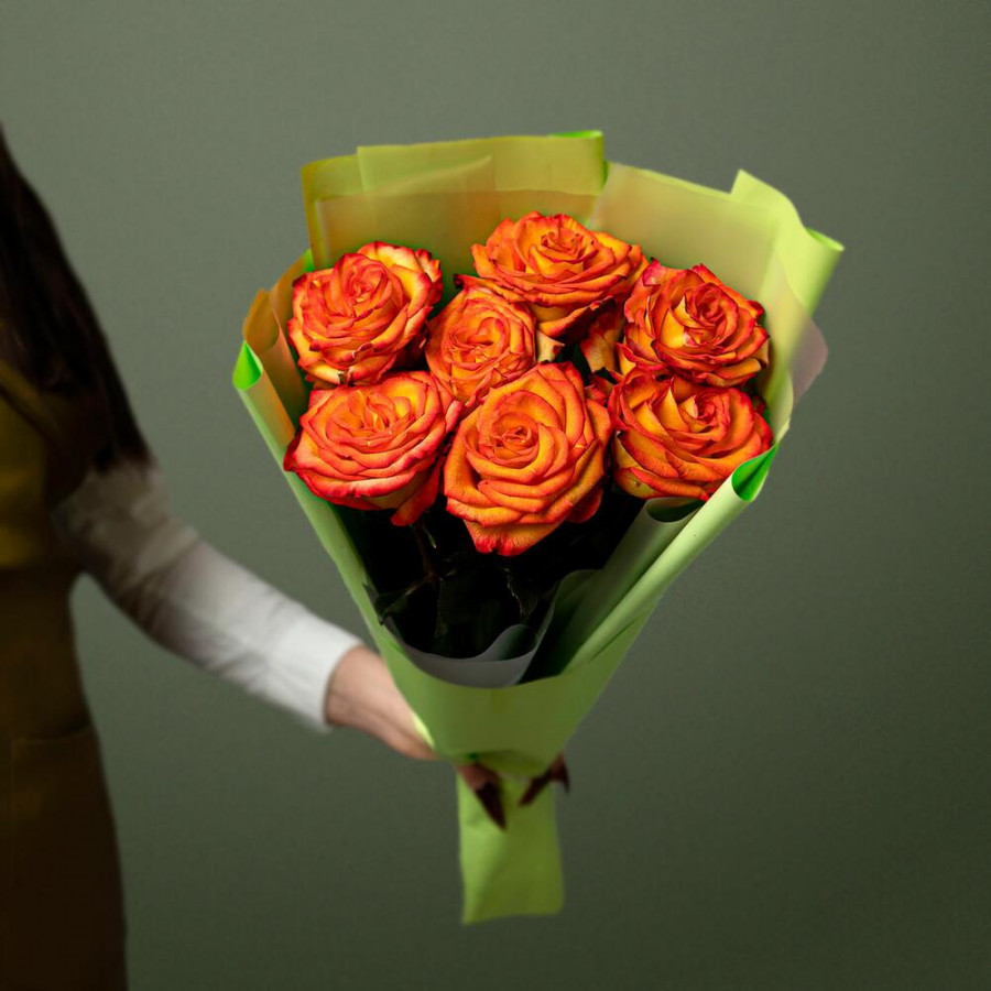 На фото букет из 7 оранжевых роз. В составе: роза 7 шт, дизайнерская упаковка 2 шт, атласная лента 1 шт, . Все цветы свежие и ароматные, букет красиво оформлен и отлично подходит для подарка. Доступна доставка цветов или самовывоз.