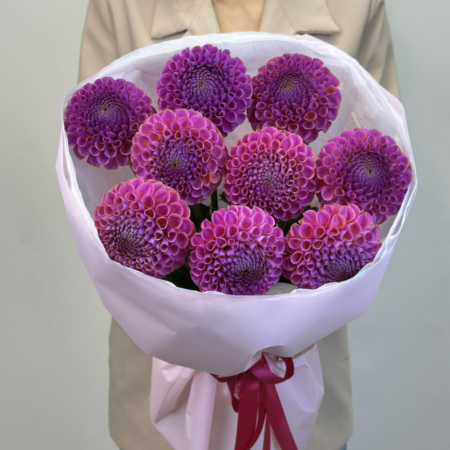 На фото букет из 9 фиолетовых георгин. В составе: георгина 9 шт, дизайнерская упаковка 1 шт, атласная лента 1 шт, . Все цветы свежие и ароматные, букет красиво оформлен и отлично подходит для подарка. Доступна доставка цветов или самовывоз.