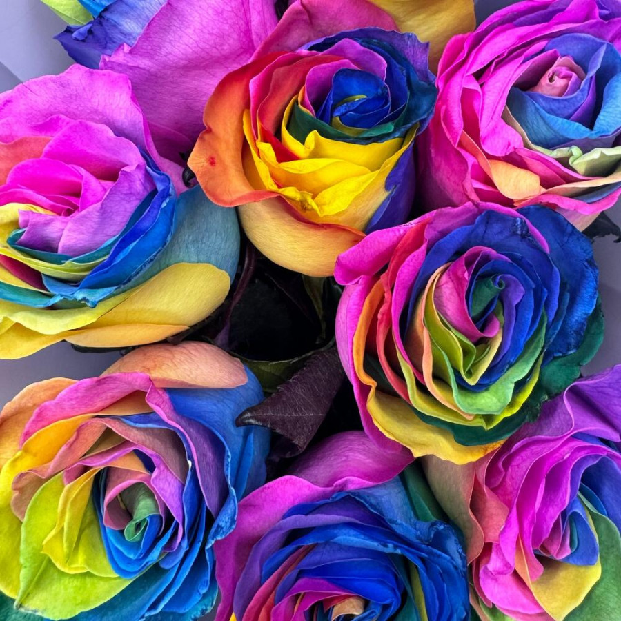 Лента атласная - 1 шт. Радужная роза - 9 шт. Дизайнерская упаковка - 1 шт.