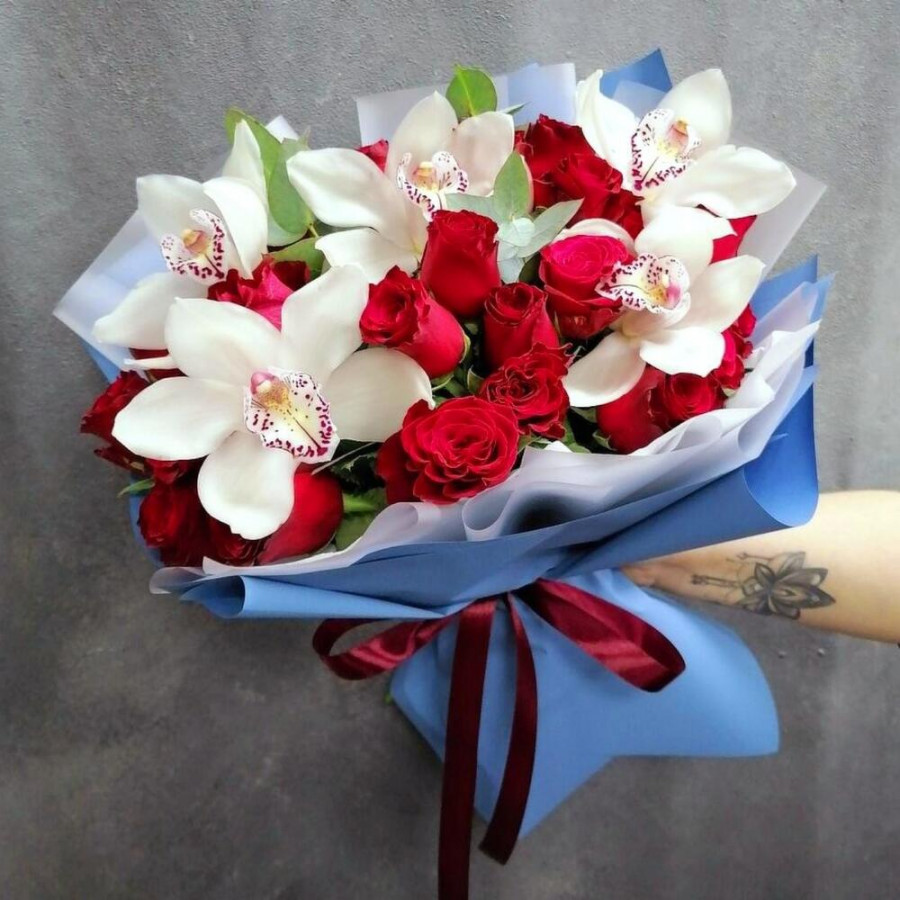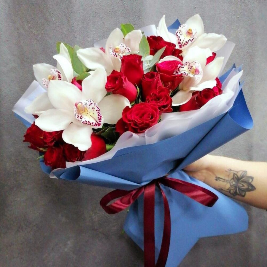 На фото букет «алое вдохновение». В составе: орхидея 5 шт, роза 21 шт, зелень 5 шт, дизайнерская упаковка 2 шт, атласная лента 1 шт, . Все цветы свежие и ароматные, букет красиво оформлен и отлично подходит для подарка. Доступна доставка цветов или самовывоз.