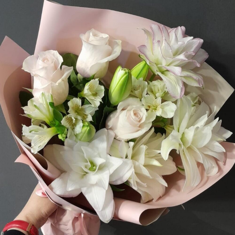 На фото букет «нежность в облаках». В составе: лилия 2 шт, роза 3 шт, альстромерия 2 шт, дизайнерская упаковка 1 шт, атласная лента 1 шт, . Все цветы свежие и ароматные, букет красиво оформлен и отлично подходит для подарка. Доступна доставка цветов или самовывоз.